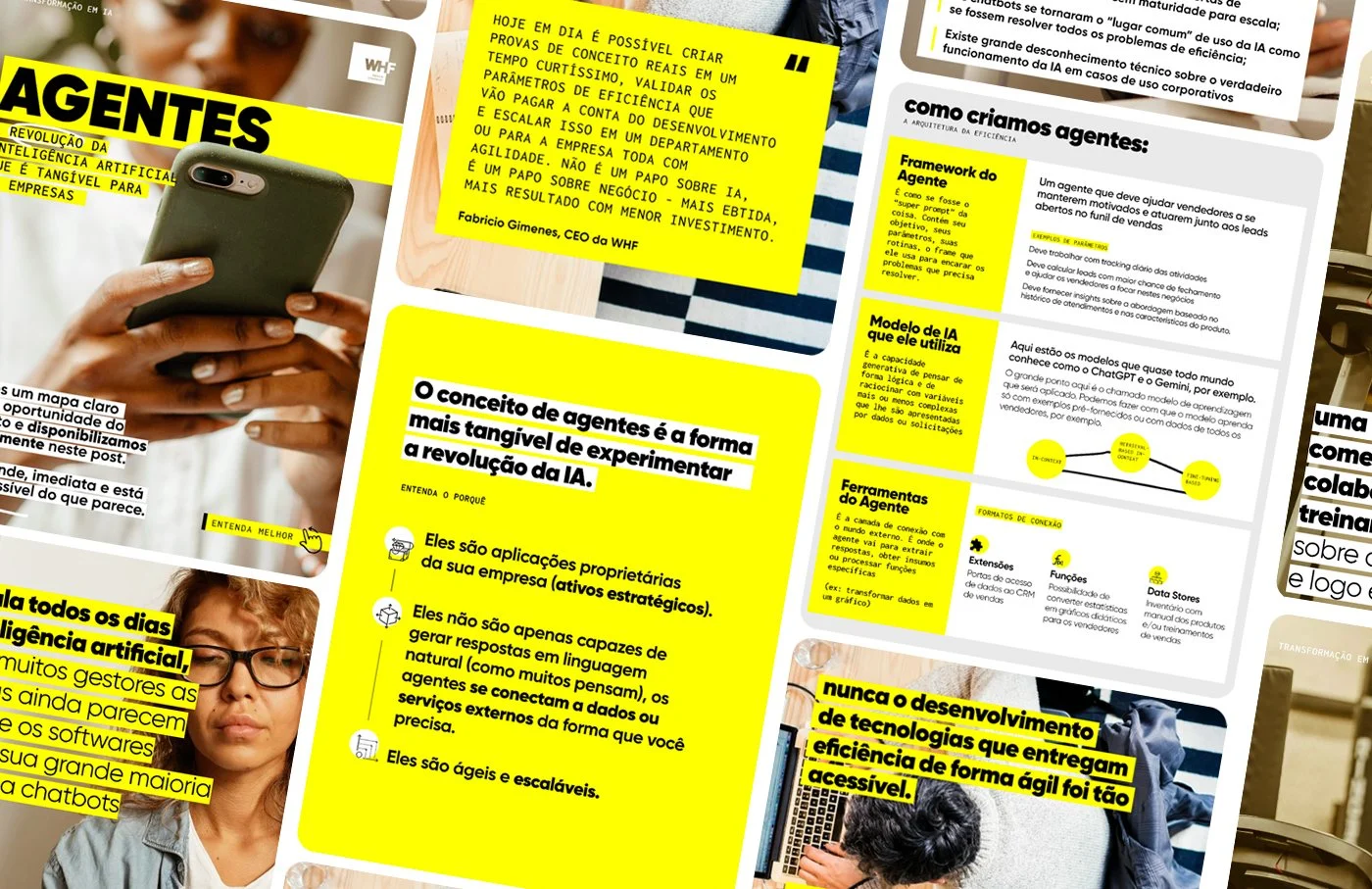 Agentes customizados são diferentes de softwares que usam IA. Eles são... customizados. São feitos sob medida para o seu problema. Na WHF estamos trabalhando com o conceito de "Smart Worker", entendendo esses agentes como colaboradores digitais, capazes de evoluir rapidamente com o direcionamento assertivo e treinamento adequado, executando tarefas com máxima precisão e produtividade.